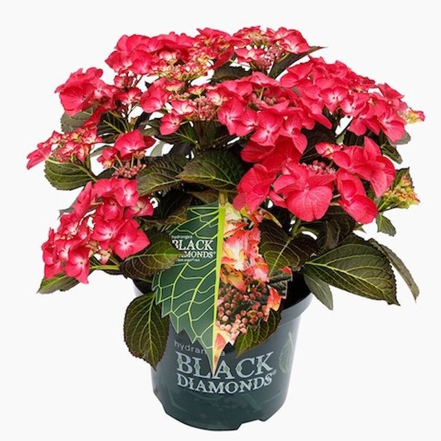 Гортензия крупнолистная Дарк Энджел Ред-А Ред, Dark Angel Red-A-Red (Hydrangea macrophylla ). Растение серии "Black Diamonds" Черный Бриллиант, Куст высотой до 1 м, ширеной до 0,8м густой, компактный. Листья крупные, темно-зеленые с глубокими бордовыми коричневыми оттенками и светло зелеными прожилками. Осенью становятся темно-красными. . Растёт медленно,. Место солнечное утром и/или вечером и полу тенистое.. Почва влажная, дренированная. На зиму требует укрытия, как для роз. Зона 5 (до -23ºС).