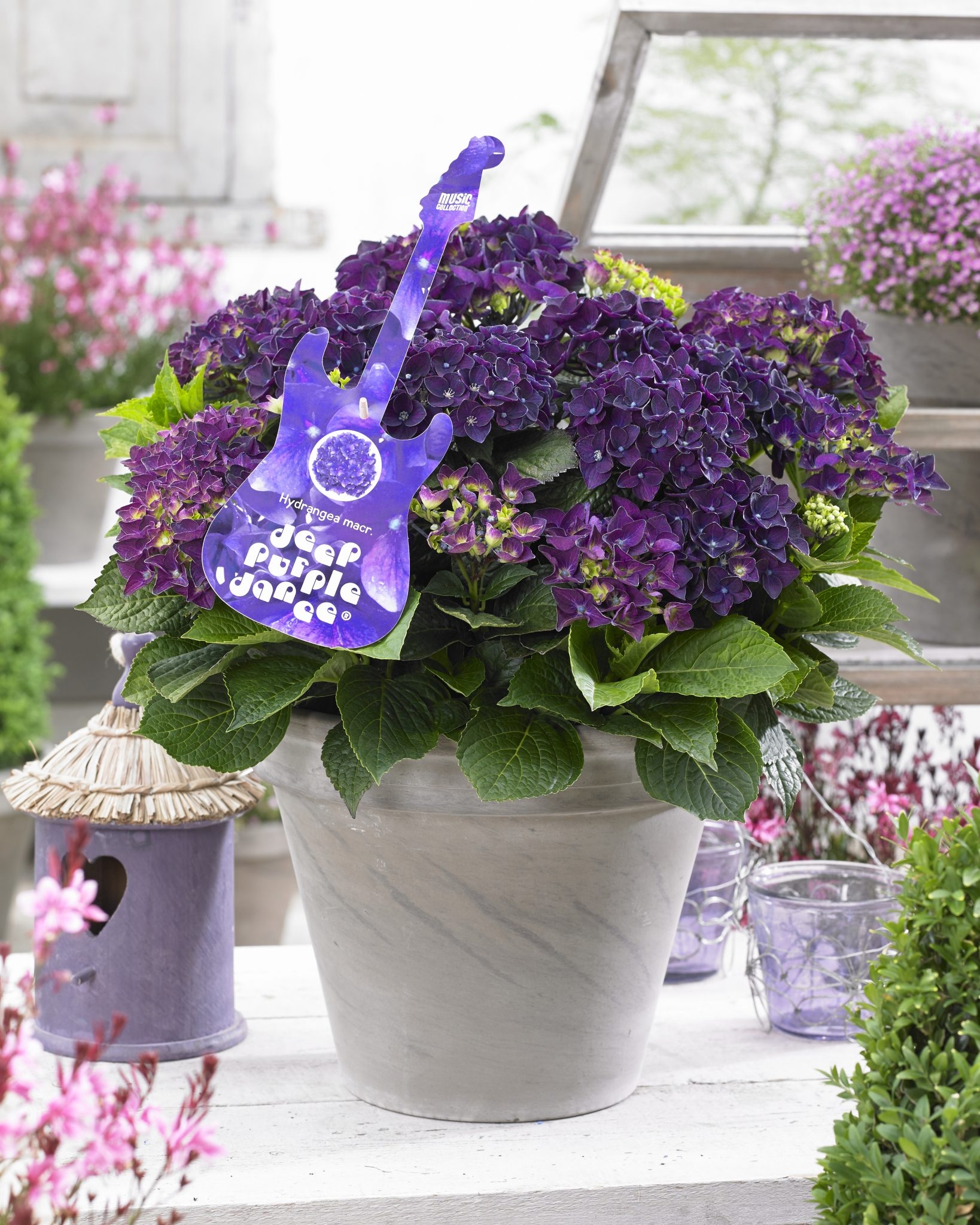 «Дип Пёрпл Дэнс» ( Deep Purple Dance) — сорт крупнолистной гортензии из серии Music Collection Куст высотой до 1 м и шириной до 80 см, компактный, хорошо подходит для выращивания в контейнерах, Цветение обильное, на побегах текущего года с июля по сентябрь Интенсивность окраски соцветий зависит от pH почвы: на кислых почвах цветы приобретают более интенсивные фиолетовые оттенки, тогда как на щелочных — более пурпурные. Важно: гортензия Deep Purple Dance устойчива к большинству болезней. На зиму растение укрывают нетканым материалом особенно в регионах с суровыми зимами. Также рекомендуют мульчирование корней слоем органики.