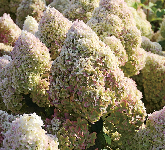 Соцветия крупные, плотные, окружностью 20–25 см. Окрас меняется в зависимости от сезона: в начале распускания — желтовато-зелёные с золотистым отливом, в конце цветения — обретают мягкий розовый оттенок.