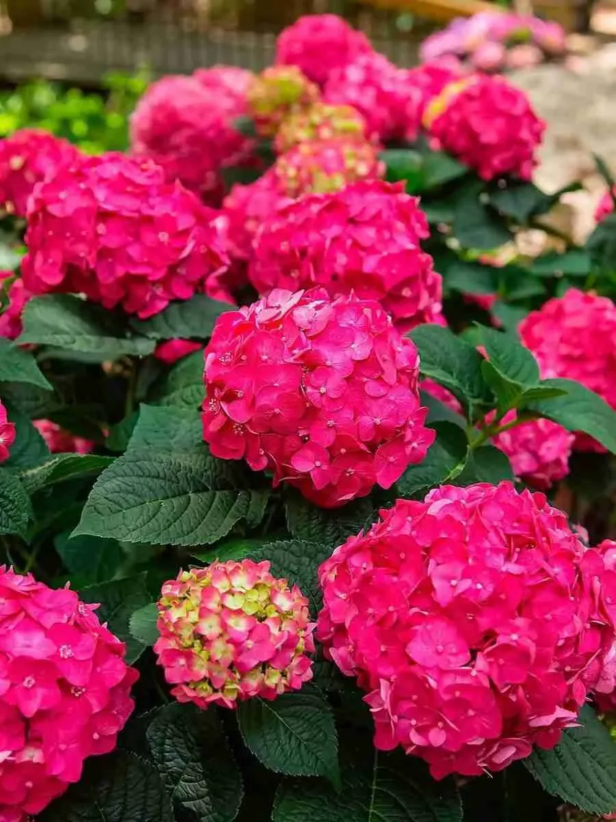 Цветки. Малиново-красные, собраны в шаровидные соцветия. Окраска может медленно меняться в зависимости от кислотности почвы: в сильнокислой почве со временем цвет сменится на пурпурно-синий.