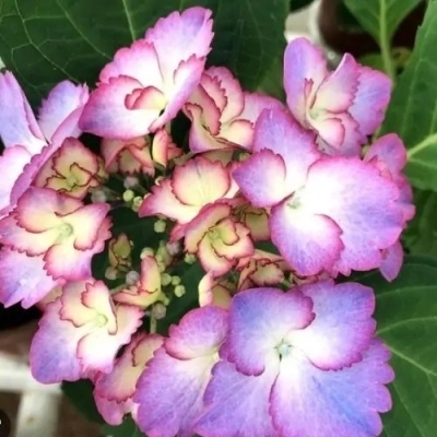 French Cancan («Френч канкан»). Соцветия крупные, представлены мелкими фертильными цветками в центре и крупными стерильными цветками по краю похожие на крылья бабочки, лепестки зубчатые, соцветия крупные, плотные. Цветки бахромчатые, полумахровые, кремово-лимонно- белые с ярко- розовой каймой.