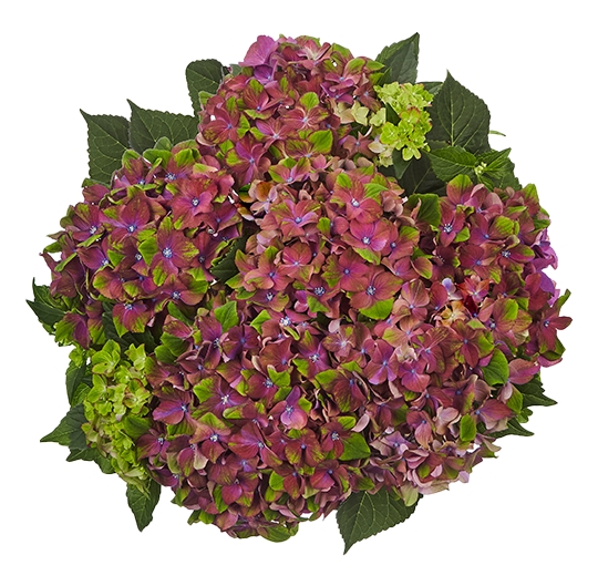 Гортензия крупнолистовая (сорт 'Magical) Glossy Lips Purple гортензия крупнолистная Соцветия крупные, до 30см в диаметре, пурпурно-зелено-фиолетовые. -огромные цветы с окраской хамелеон. По мере взросления цвет меняется на другой оттенок