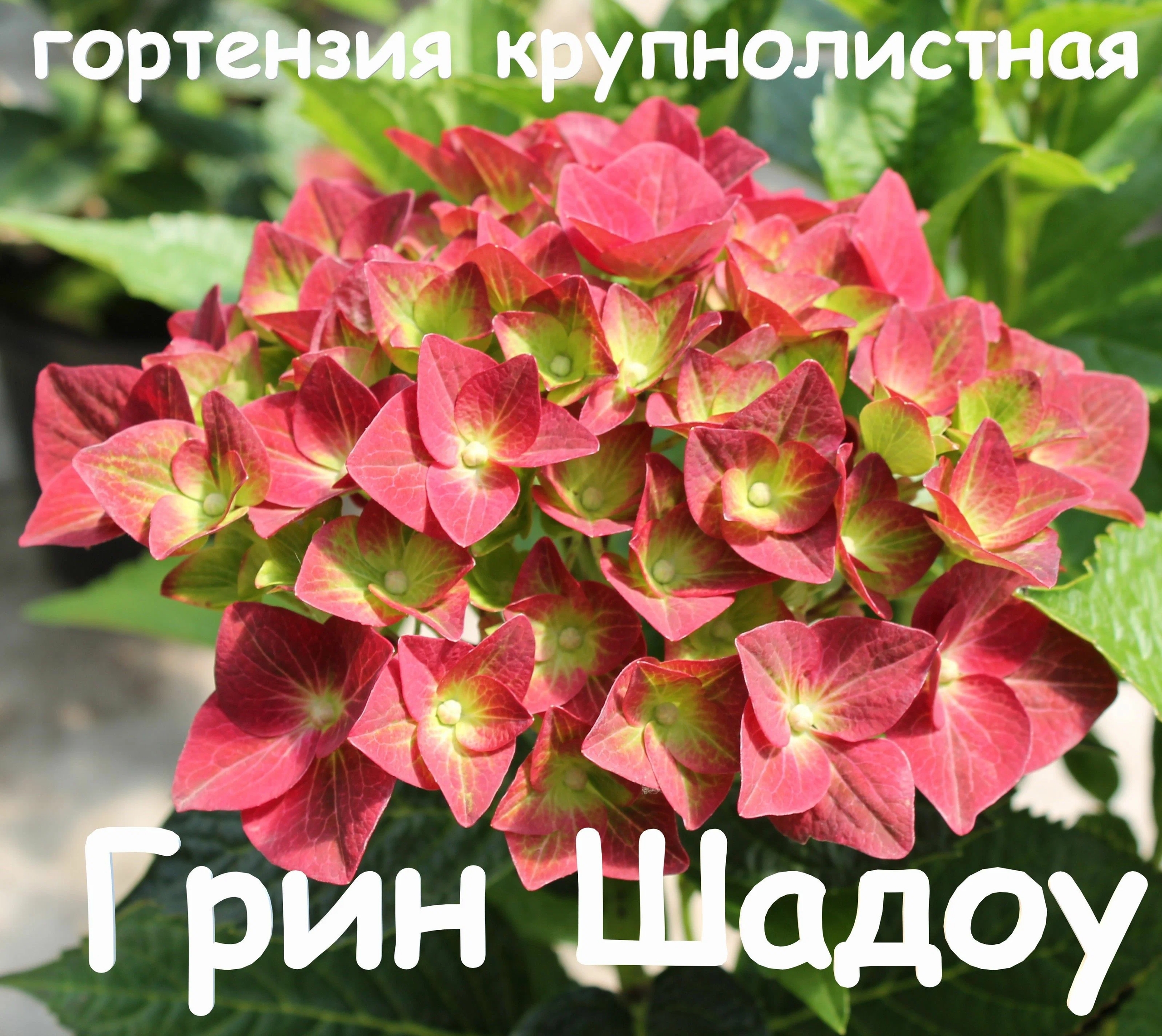 GREEN SHADOW ГОРТЕНЗИЯ КРУПНОЛИСТНАЯ Сорт интересен своими необычными цветками, которые в начале цветения зеленые, потом постепенно меняют окраску на темно-красную, остается только зеленая серединка, не выцветают. Цветки без запаха. Отличается быстрым ростом. Высота этого растения не превышает 100 см, а диаметр может достигать 70 см. Листья продолговатые, зубчатые по краю, ярко-зелёного цвета. Соцветие имеет длину около 15 см и состоит из малиновых цветков с зелёными тенями по краям.