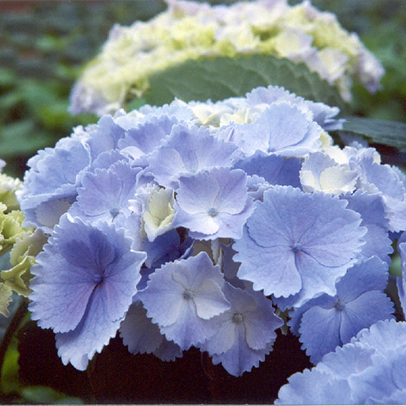 Соцветия крупные, диаметром 10-20 см, В первой фазе цветения они светло-голубые или розовые в зависимости от кислотности почвы (в кислой почве будут всевозможные фиолетово-синие оттенки). Во второй фазе цветки зеленеют, и в третьей - становятся бордовыми..
