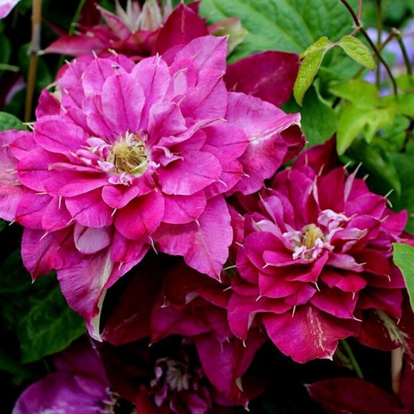Цветки махровые, красно-пурпурные с лиловыми тенями, устойчивы к выгоранию.