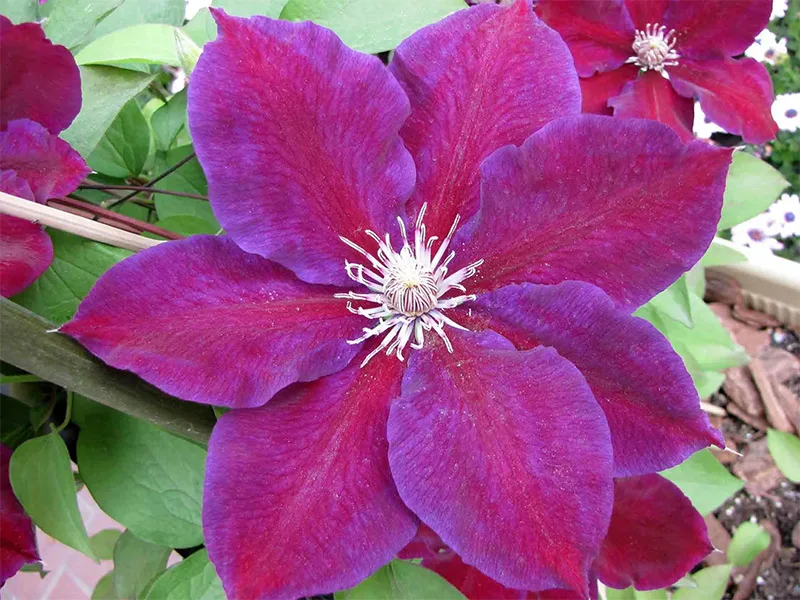 Эффектная вьющаяся лиана! Своей популярностью сорт обязан великолепным крупным цветкам фиолетового или красного цвета.