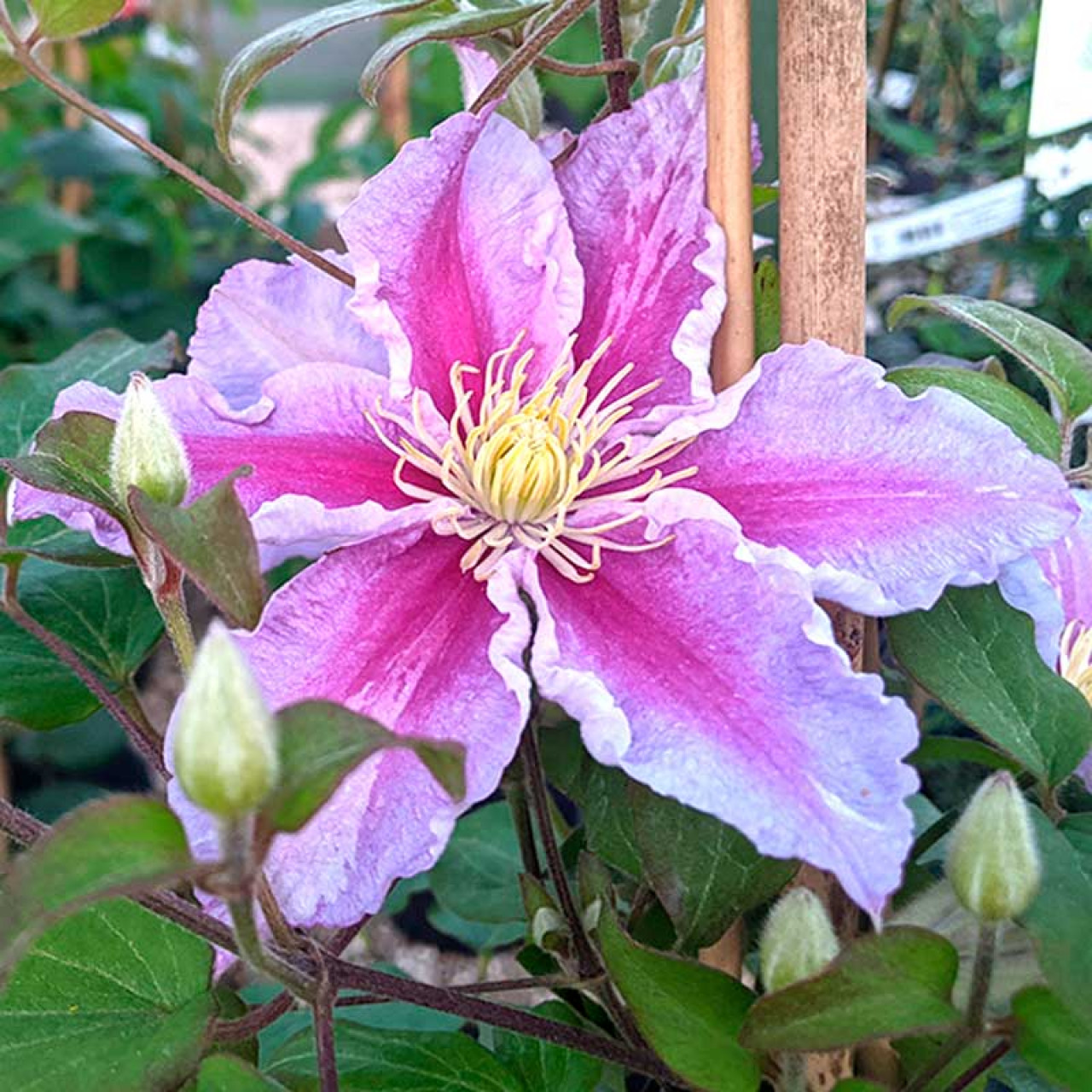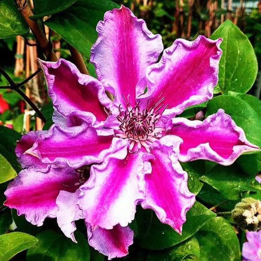 Крупноцветковый, раннецветущий сорт, отличается продолжительным, обильным цветением, неприхотливостью в уходе и морозостойкостью. Бледно-лиловые цветы с яркой пурпурно-красной полоской у каждого лепестка. Лепестки имеют необычные волнистые поля, которые вьются внутрь в привлекательных оборках. Используется для посадки у всех садовых опор, решёток или среди кустарников. Для контейнеров.