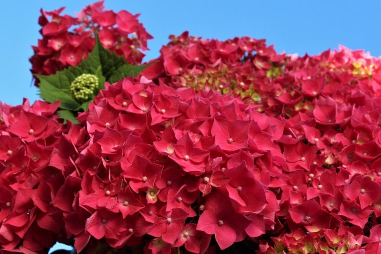 Соцветия: крупные (20–25 см в диаметре), шаровидные, расположены на концах побегов. Бесплодные цветки — розовые с тёмно-карминовыми мазками, плодущие — сиреневые, голубые, иногда белые или комбинированные.