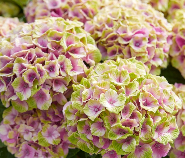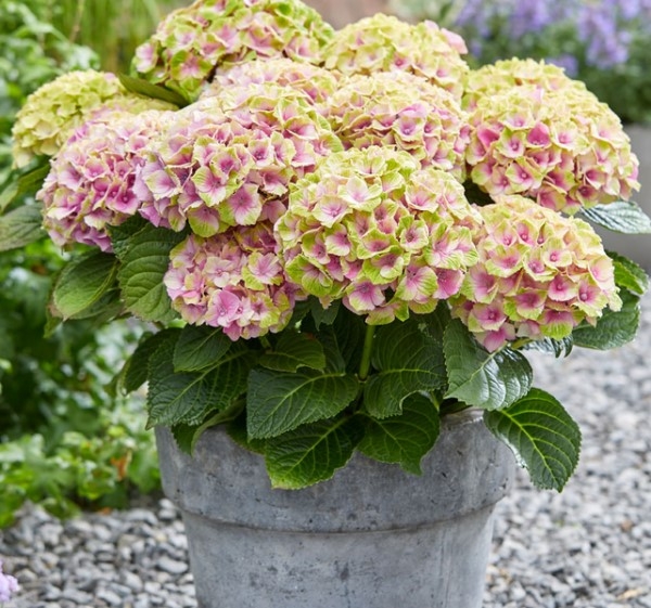 Гортензия крупнолистная из серии Magical: Jewel Pink/ Мэджикал : Джевел Пинк Зацветает цветками лаймового цвета, затем становится розовым от центра цветка. Magical Jewel — эффектный сорт с аккуратным и компактным ростом, до 90см, дающий множество цветущих побегов. Благодаря компактному росту эта гортензия прекрасно подойдет для горшка на патио или террасе.