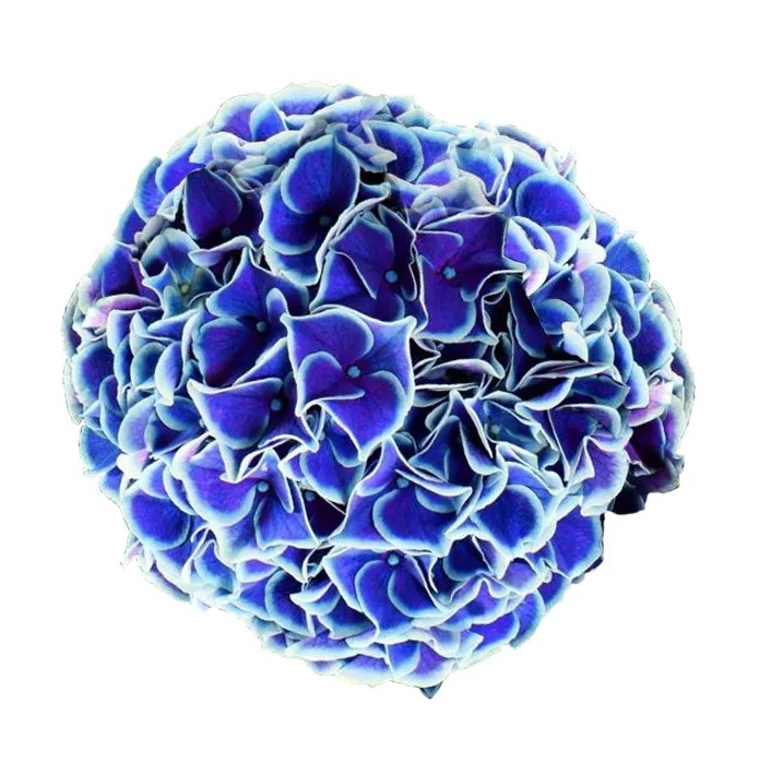 Цветы: цветет крупными соцветиями сине-фиолетового цвета с белой каймой по краю. В зависимости от местоположения белая кайма может быть толще или тоньше. Диаметр соцветия до 20см.