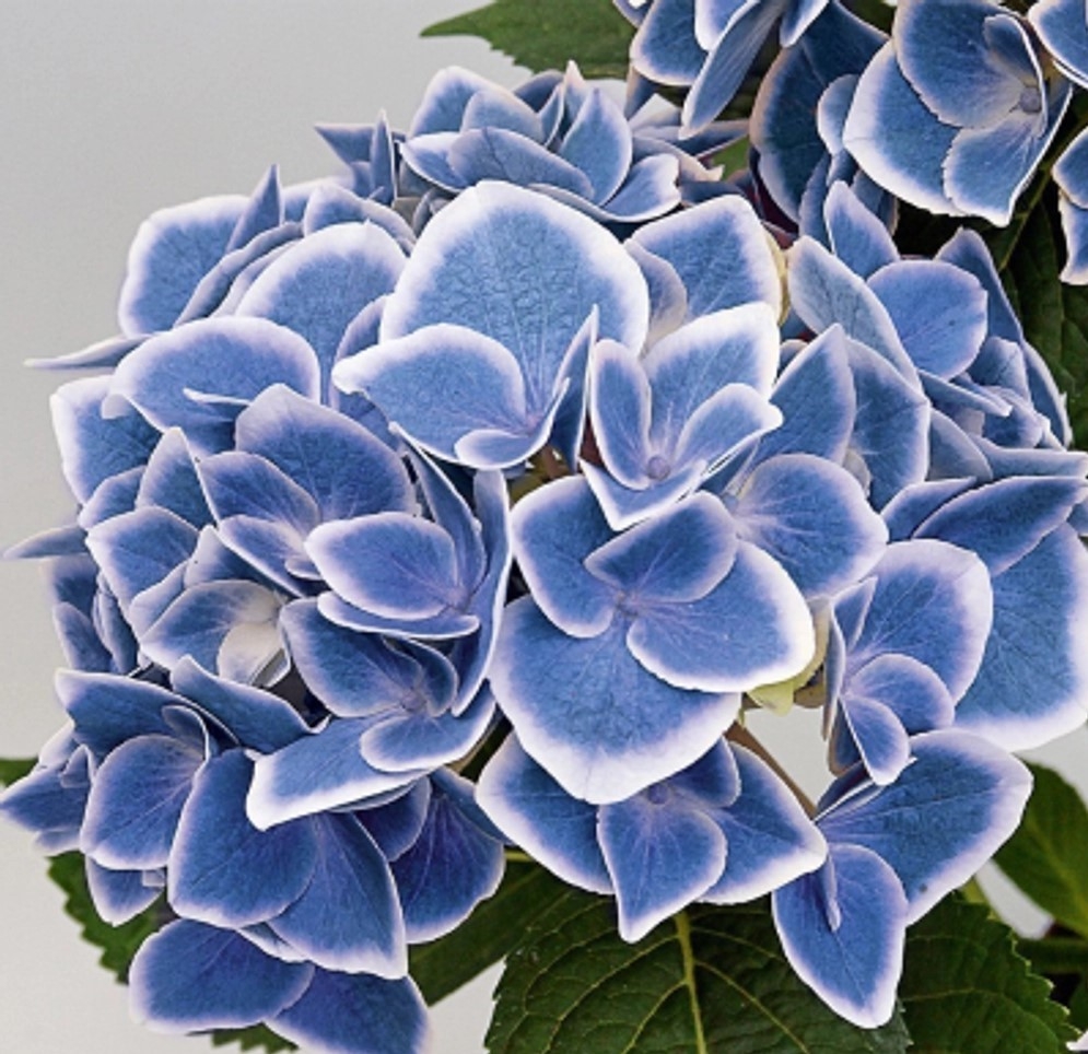Гортензия крупнолистная Нью Тиволи Блю Цветет крупными соцветиями сине-фиолетового цвета с белой каймой по краю.