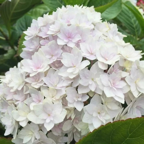 Куст высотой 125 см имеет округлую крону. Цветет с июля по октябрь на побегах прошлого года белыми с розовым румянцем соцветиями из махровых цветков. Листва темно-зеленая.