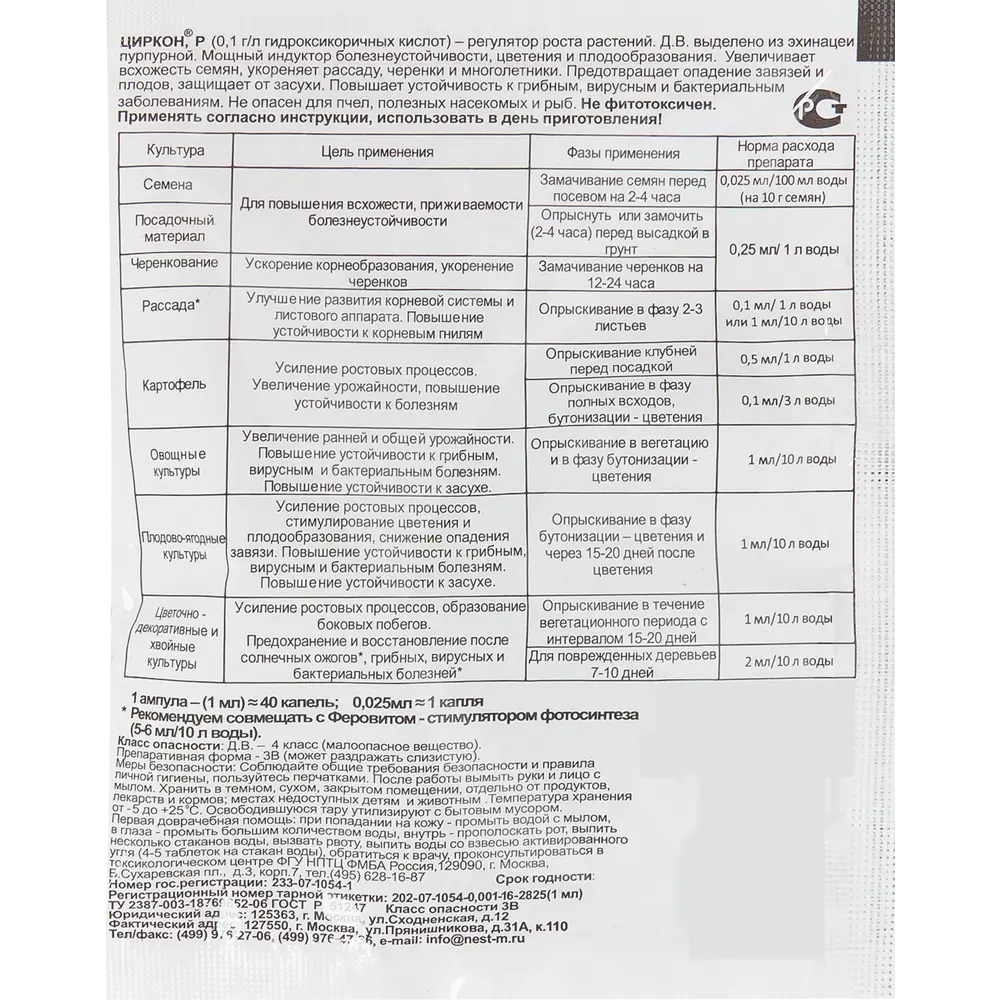 Корнеобразователь, индуктор цветения и плодоношения «Циркон» является препаратом широкого спектра действия, обладающим мощным фунгицидным и антистрессовым действием. Он изготовлен из природного сырья, поэтому не может нанести вред как растениям, так и окружающей среде. Средство способствует нормализации гомеостаза, защищает сельскохозяйственные культуры от загрязнения тяжелыми металлами, засухи и вредного УФ-излучения. Купить это средство можно для замачивания семян перед посадкой и опрыскивания вегетирующих растений.