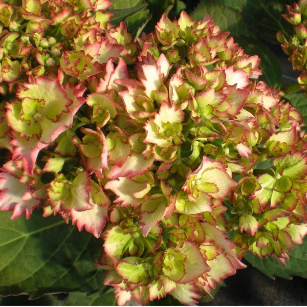 Гортензия крупнолистная Коктейль («Rendes-vous/Cocktail)Цветки бахромчатые, полумахровые, в начале цветения кремово-лимонно-белые с ярко-розовой каймой.