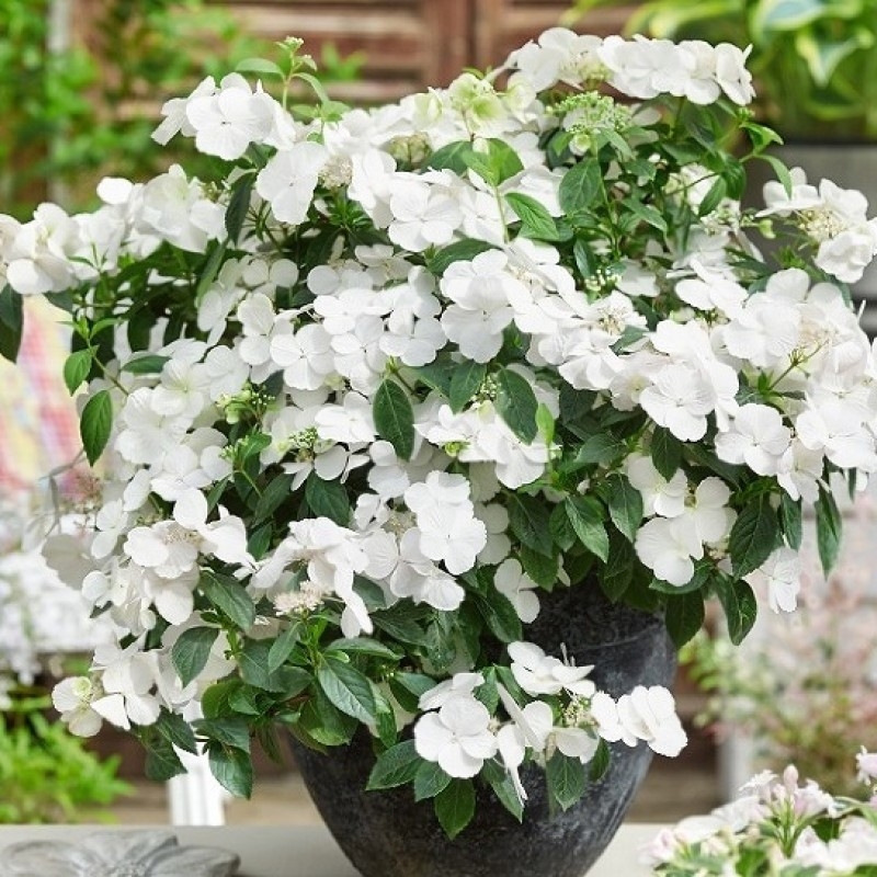 Гортензия гибридная Сбежавшая невеста (Runaway Bride) уникальная ампельная гортензия, Декоративные особенности высота до 50 см. и в ширину до 100 см, В начале цветения появляются освежающие зеленые цветочные бутоны. По мере цветения цвет меняется от белого до бледно-розового. Цвет цветка не меняется в зависимости от pH. Цветет с июня по август. Уникальный , дающий две волны декоративности за сезон сорт Цветение очень пышное