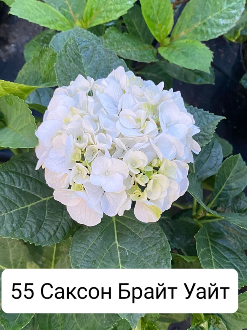 Гортензия серии из SAXON «Брайт Уайт» (Saxon «Bright White») Гортензия крупнолистная Саксон «Брайт Уайт» (Saxon «Bright White») РЕМОНТАНТНАЯ Высота взрослого растения 150 см Диаметр цветка 20 см Период цветения июнь-сентябрь Зимостойкость Зона 6 (от -23 до -18°C) Цвет цветка белый. Листья у этой крупнолистной гортензии большие, яйцевидные, супротивные, весной и летом ярко-зеленого цвета, к осени начинают краснеть, благодаря чему куст гортензии практически весь сезон остается декоративным.