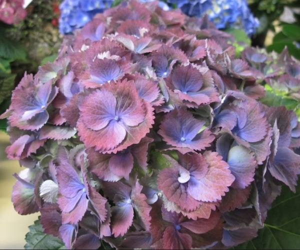 Гортензия крупнолистная «Штрамини» (Джемини) Соцветия округлые, состоят из двухцветных цветков: сине-фиолетово-зелёного на кислых почвах и розово-зелёного — на щелочных. По мере цветения присутствуют оттенки жёлтого, оранжевого, лавандового. Куст высотой 80–120 см