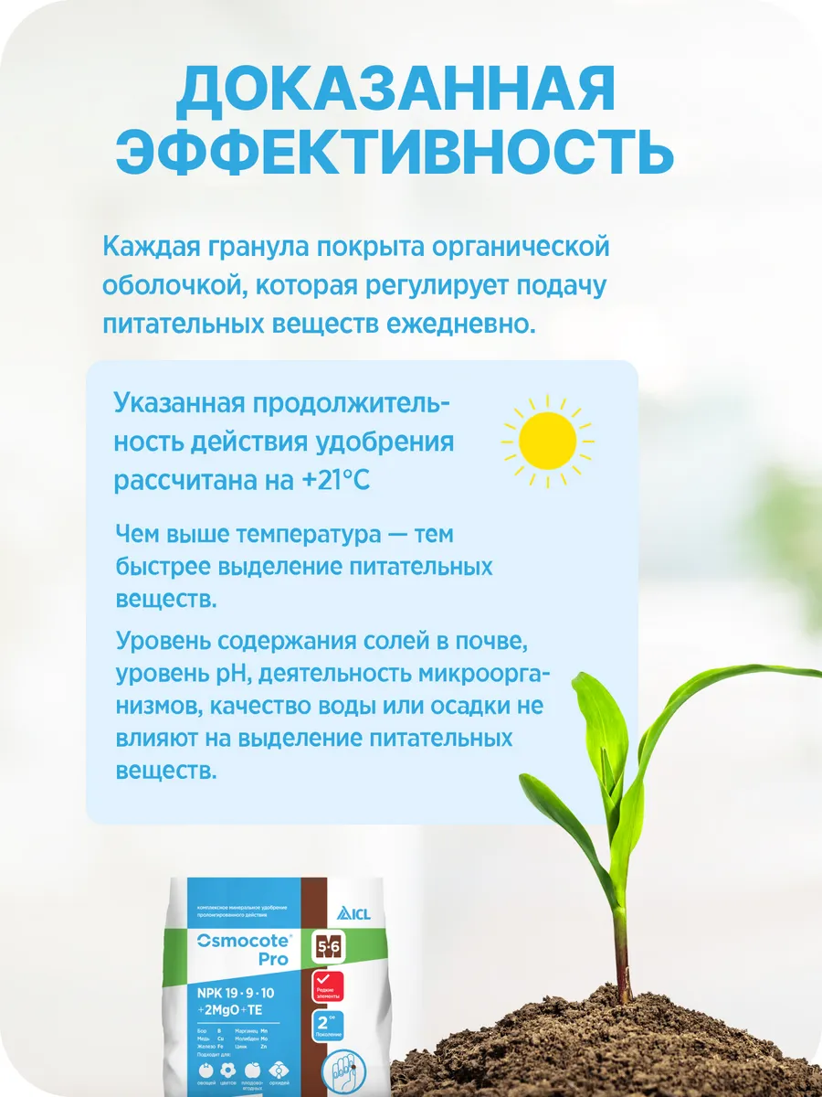 Osmocote Pro 5-6 месяцев – универсальное удобрение пролонгированного действия Полноценное питание растений на полгода без дополнительных подкормок Уникальные особенности Технология контролируемого высвобождения – питание растений 5-6 месяцев Усиленная азотная формула (19% N) – идеально для весеннего старта Сбалансированный состав: NPK 19-9-10 + 2% MgO Полный комплекс микроэлементов Безопасность: Не вызывает ожогов корней Не вымывается дождями Нормы внесения: Комнатные растения - Смешивание с субстратом - 3-4,5 г/л (1-1,5 ч.л.) Рассада - Добавление в грунт для посева - 2,5-3,5 г/л Огородные культуры - Внесение в лунки - 60-80 г/м² Декоративные кустарники - Заделка в почву при посадке - 300-450 г/м³ Справочно: 1 чайная ложка ≈ 3 г Преимущества Osmocote Pro Экономия времени – одно внесение заменяет 5-6 обычных подкормок Универсальность: Горшечные и контейнерные растения Овощные грядки Плодово-ягодные культуры Хвойные и декоративные кустарники Адаптация к температуре – скорость высвобождения зависит от прогрева почвы