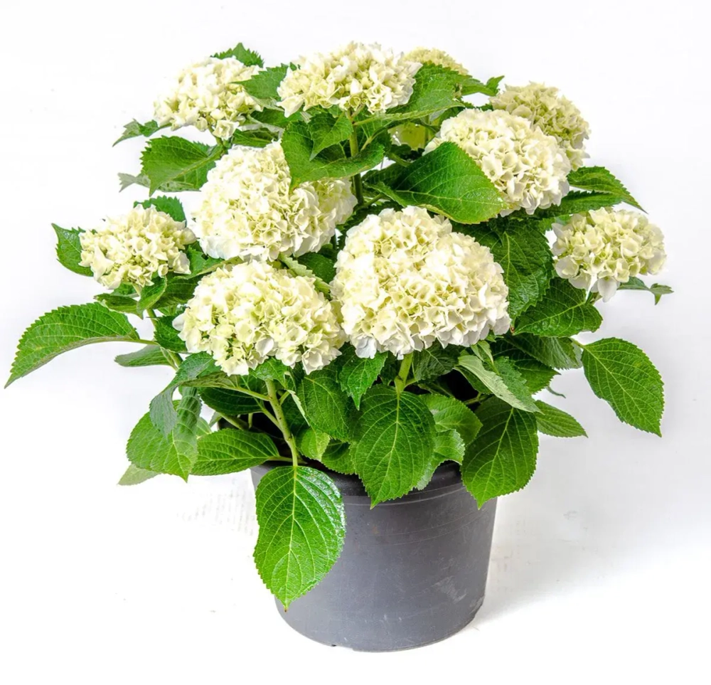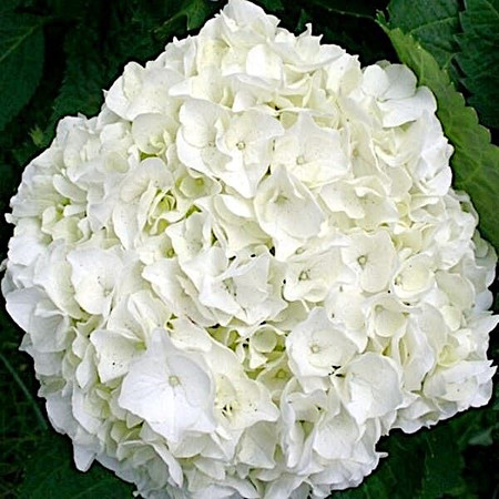 Крупнолистная гортензия (Hydrangea macrophylla) «Вуду» (Wudu) Цветение обильное, цветки собраны в плотные шары 20-25 см в диаметре, в роспуске слегка зеленоватый оттенок, позднее переходящие чисто-белые а крупные заострённые листья добавляют шарма.
