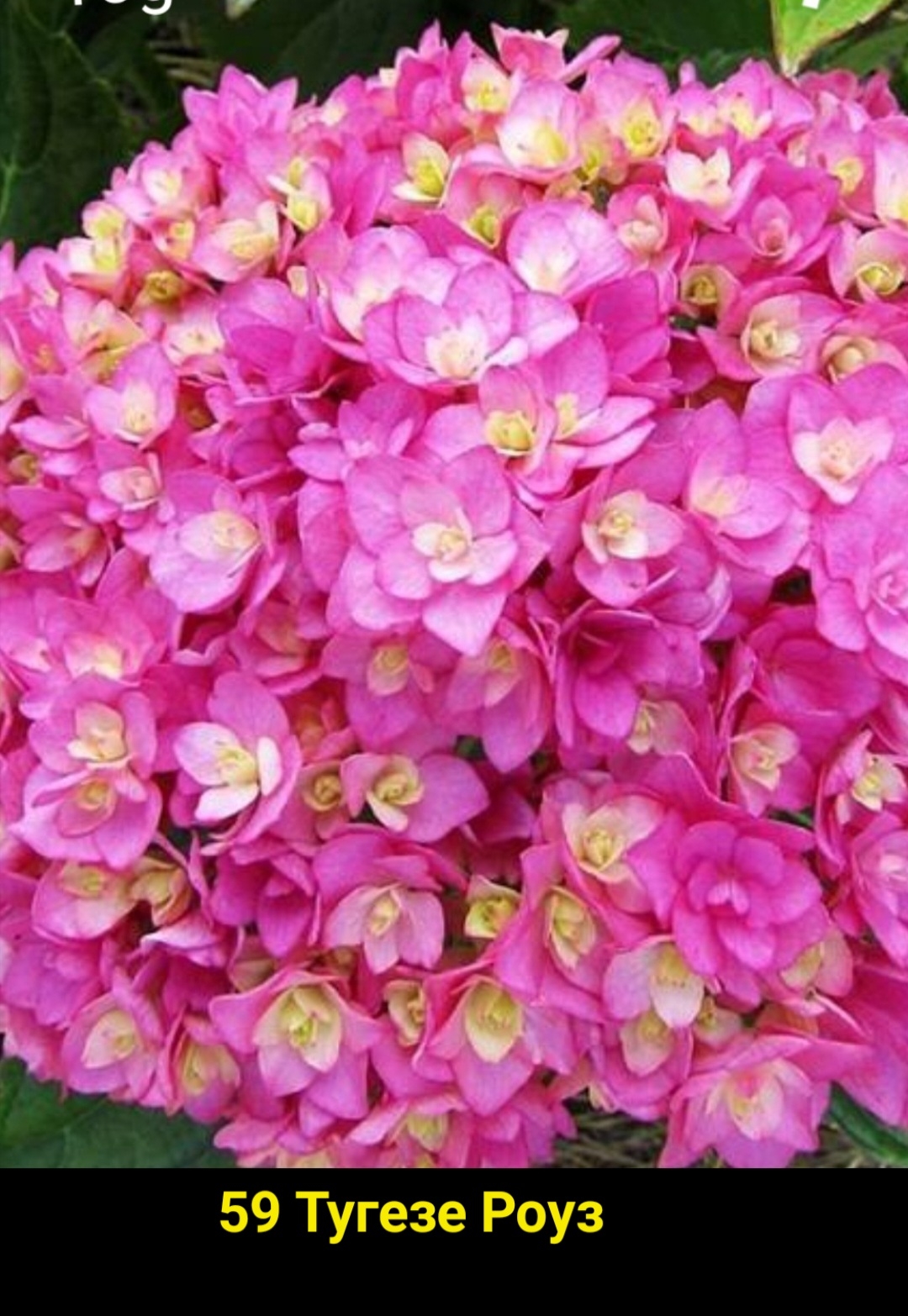 Цветки махровые, в начале цветения светло-зелёные, затем розовые или голубые (в зависимости от кислотности почвы), к концу цветения фиолетовые или красные, равномерно расположены в плотных соцветиях диаметром 20 см.